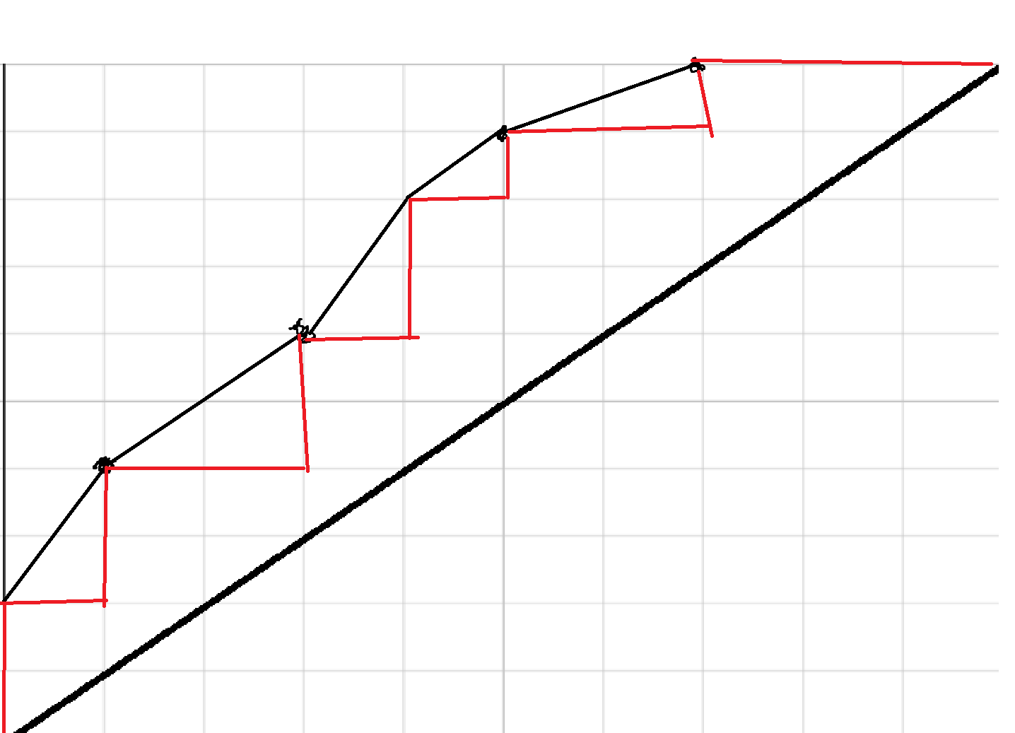 建立平面直角坐标系,令点 1∼n1\sim n1∼n,第 iii 个点的坐标为 (a2i−1,a2i)(a_{2i-1},a_{2i})(a2i−1,a2i),则所有点都在直线 x=yx=yx=y 的上方,点 i+1i+1i+1 在点 iii 的右上方,点 111 在 x=1x=1x=1 上,点 nnn 在 y=2ny=2ny=2n 上,相邻两个点向右下作直角三角形,形成一条卡特兰数经典定义路径。