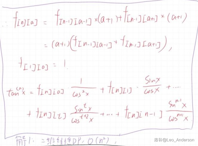 对于该草稿展示的算法,输入 nnn,输出 tan(n)xtan^{(n)}xtan(n)x 的多项式表达形式。 这个算法的时间复杂度是 O(n2)O(n^2)O(n2) 吗? 并且这里面的 f[n][a]f[n][a]f[n][a] 我查到的应该是zag数(A000182- OEIS , OI Wiki-Entringer Number#恩特林格数与-zigzag-数的关系 ),那么这个算法还可以通过亿些奇妙手段优化时间复杂度吗?